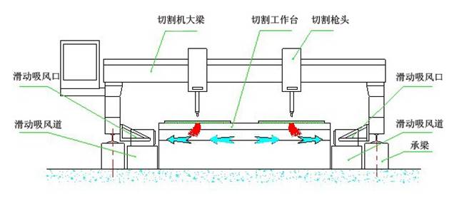 側(cè)吸式煙塵凈化系統(tǒng)采用吸風(fēng)口固定在切割機(jī)龍門架上,吸風(fēng)口與吸風(fēng)道之間通過密封皮帶密封,吸風(fēng)口可隨龍門架在吸風(fēng)道上來回移動(dòng)吸風(fēng),將切割的粉塵吸除。