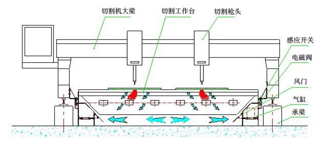 下吸式煙塵凈化系統(tǒng)抽風(fēng)是通過下吸式抽風(fēng)切割臺(tái)來實(shí)現(xiàn)的,下吸式抽風(fēng)切割臺(tái)分成若干個(gè)區(qū)域,每個(gè)區(qū)域設(shè)計(jì)有風(fēng)門吸風(fēng),切割槍頭在每個(gè)區(qū)域切割時(shí),相應(yīng)區(qū)域的風(fēng)門打開抽風(fēng),將切割機(jī)的粉塵吸除。