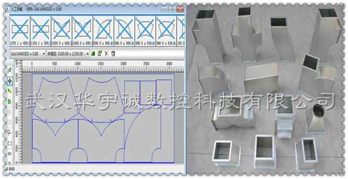 加工范圍:0.2-6.0mm任意材料鋼板的切割成型!可切割各種異形件,電腦直接畫圖,導(dǎo)出加工程序,批量高速切割,效果好,精度高,不掛渣!配合專用的風(fēng)管展開軟件,自動生成圖紙、導(dǎo)出加工程序。操作人員所需要做的就是在軟件中選擇所需要的風(fēng)管樣式,輸入所需要的尺寸,然后調(diào)出加工程序進(jìn)行切割就可以了。既方便快捷、又精確實用。